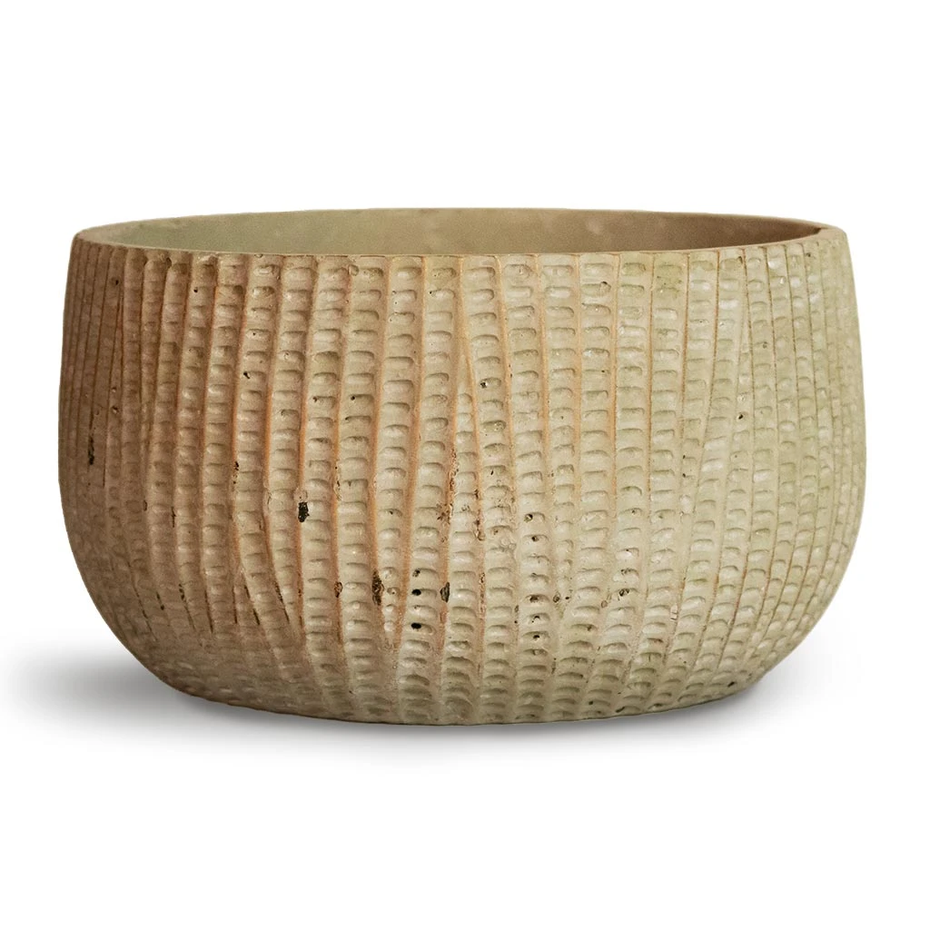 Muted mint textures combine with artisan clay latticework and hints of soft gold threads to give the Feico plant bowl a calming natural elegance for displays of wellbeing greenery.