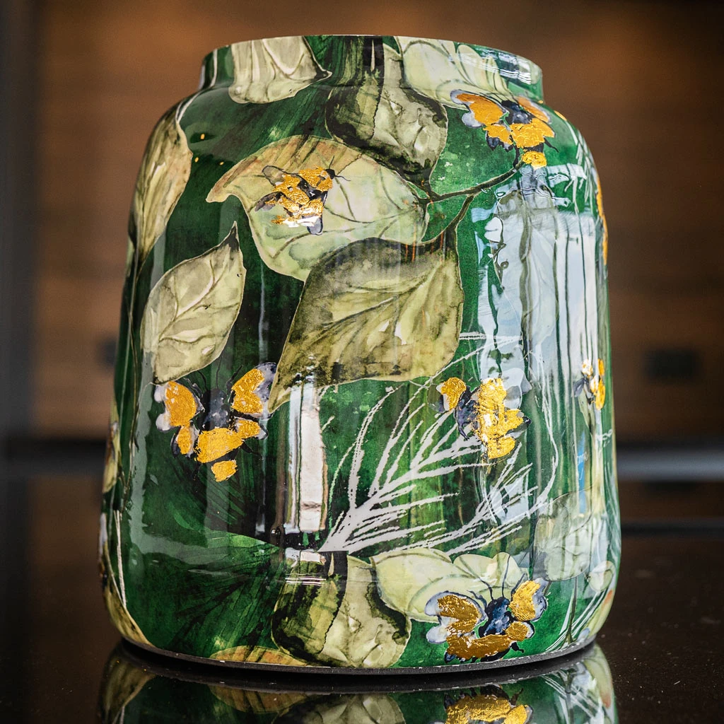 Lammie’s elegant design features nature-inspired artwork on its surface. The emerald green vase is beautifully moulded and adorned with leaf and bee designs, enhanced by a lustrous gloss. Subtle gold embellishments add a touch of sophistication, elevating its visual appeal with added opulence and luxury.