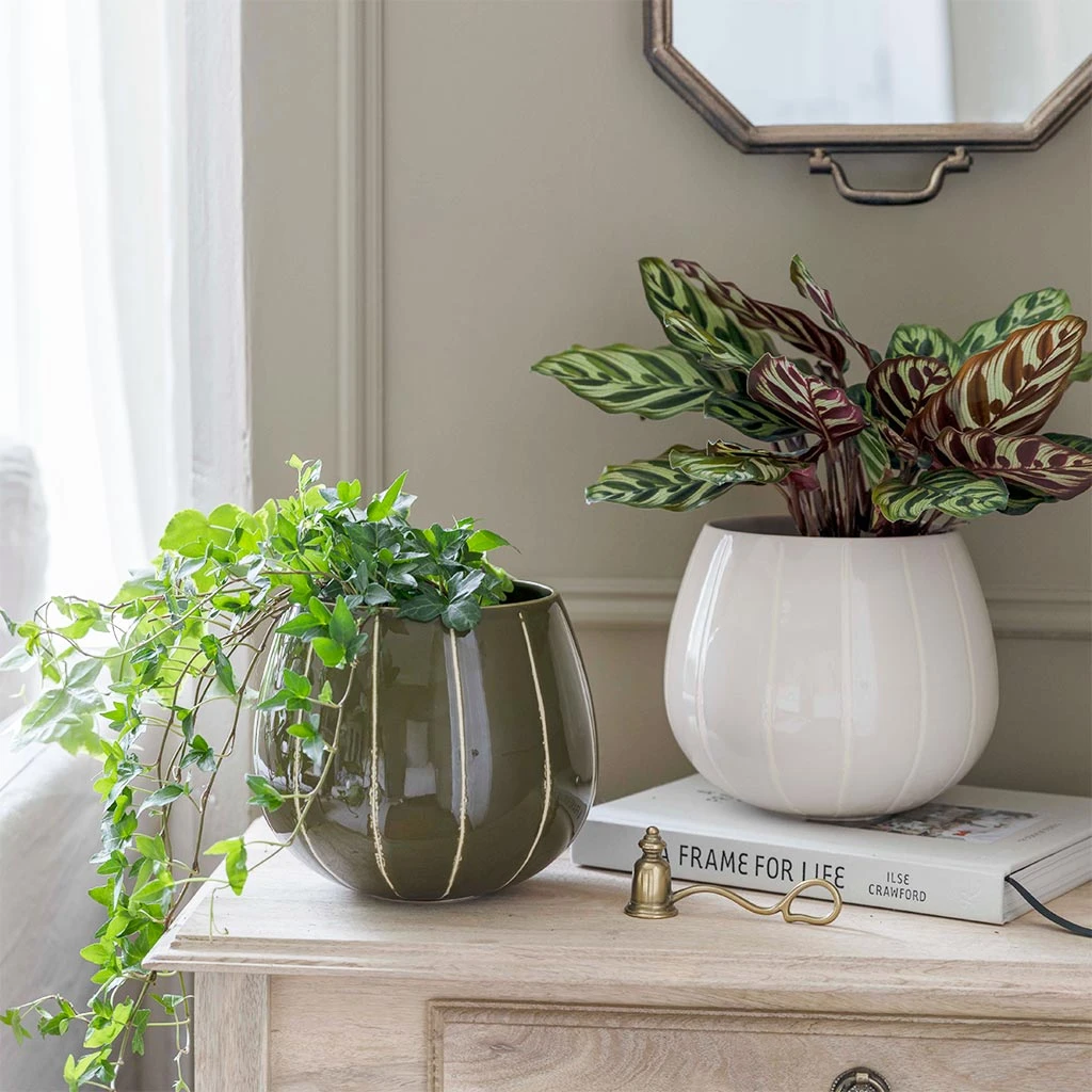 Enhance your space with the elegant Nova Plant Pot, finished in clean and contemporary cream. Delicate white lines embellish the glossy ceramic, hand-applied using the traditional wax relief method. This graceful detailing accentuates its tulip-shaped silhouette, infusing your indoor plant arrangements with a captivating artistic charm.