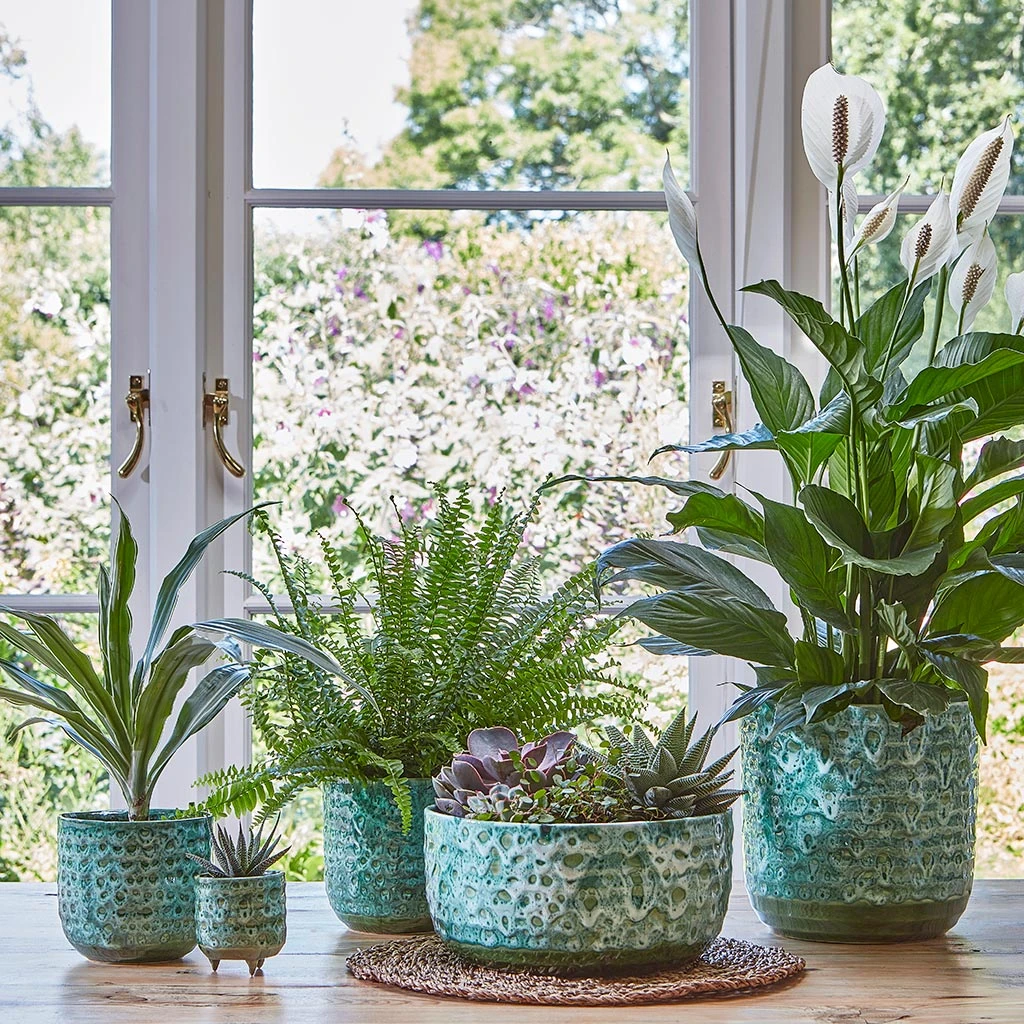 Dive in and bring the serenity of the sea to your plant collection with the aquatic allure of the Ocean Glaze Plant Pot Collection. The collection features plant bowls with a reactive glaze that combines whites into a deep ocean green, adorned with flecks of emerald. The bowl-shaped plant pots are finished with a glossy, polished glaze, completing the oceanic appearance.