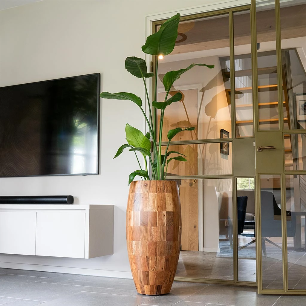 Meticulously handcrafted with precision and a profound respect for the natural world, the sleek tall curvaceous shape of the Quinn Tall planter is crafted from eco-friendly mango wood, offering a harmonious fusion of nature and design for contemporary indoor greenery.